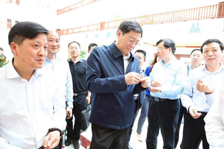 杜家毫省长对公司生产的淀粉植物胶囊表现出浓厚的兴趣,正拿着产品详细观看。