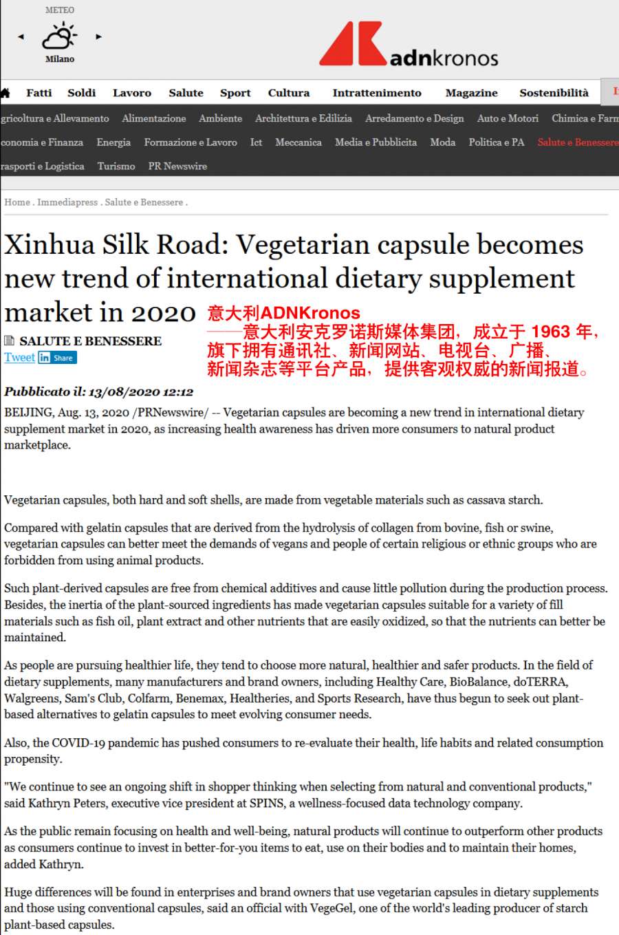 日前,植物胶囊在国际上再度引起关注,一篇题为《Vegetarian capsule becomes new trend of international dietary supplement market in 2020》探讨淀粉植物胶囊或成2020年膳食补充剂新趋势的文章,被北美Fox、Yahoo! Finance、Business Insider: Markets Insider 、Seeking Alpha、Canadian Business Journal,欧洲Xpert、Notre Siècle、FinanzNachrichten.de、ADNKronos 、Europa Press 、PAP等超40余国家、全球近900家国际媒体转载发布。